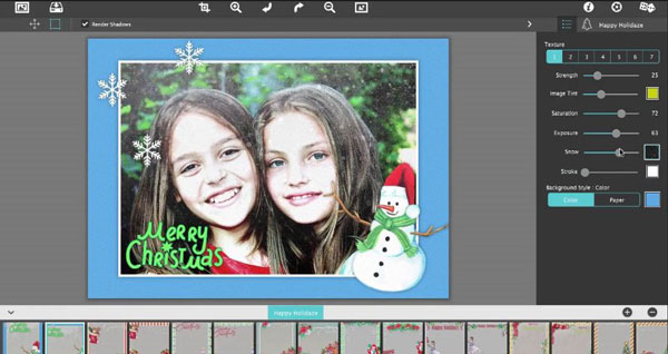 به شما امکان میدهد تا بتوانید با استفاده از آن بتوانید راه های ایجاد ارتباط با افراد مورد علاقه بسیار شاد و آسان باشد. ویژگی های نرم افزار Happy Holidaze: دارا بودن مقاله ها و پس زمینه های متعدد زیبا و جذاب امکان تنظیم تصویر و نور برای بدست آوردن ظاهر قدیمی تر قابلیت اضافه کردن برف به عکس ها دارا بودن کتابخانه ای شخصی سازی شده و پر از آثار هنری قابلیت خاموش یا روشن کردن سایه ها ، دارا بودن 7 حالت از تنظیمات متنی قابلیت بارگذاری فایل ها از طریق تلفن های هوشمندگالری تصاویر :