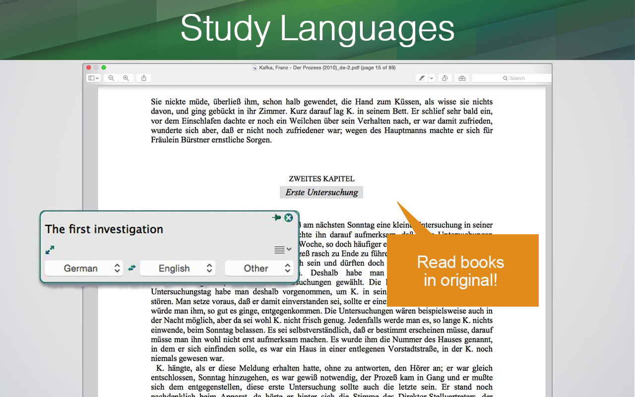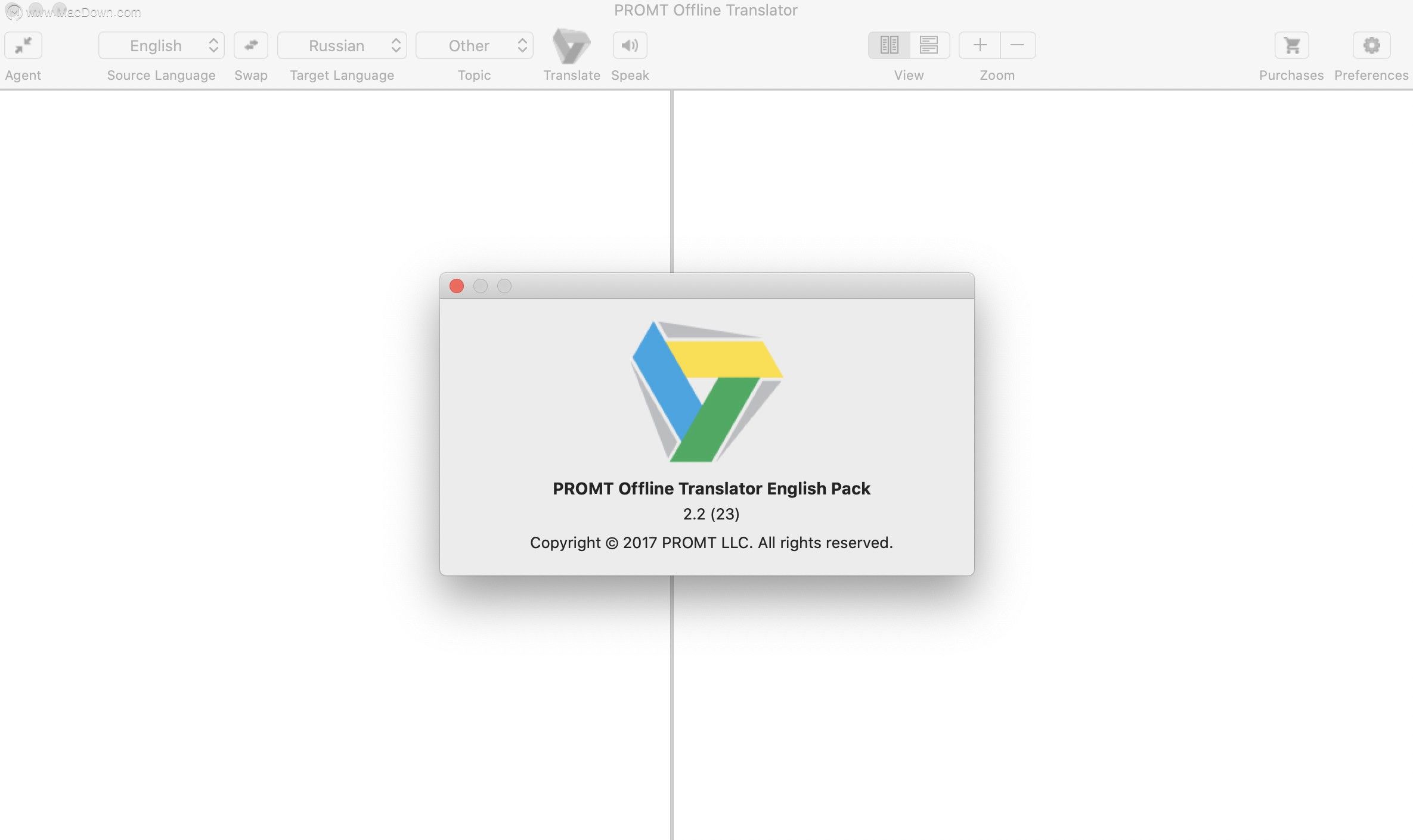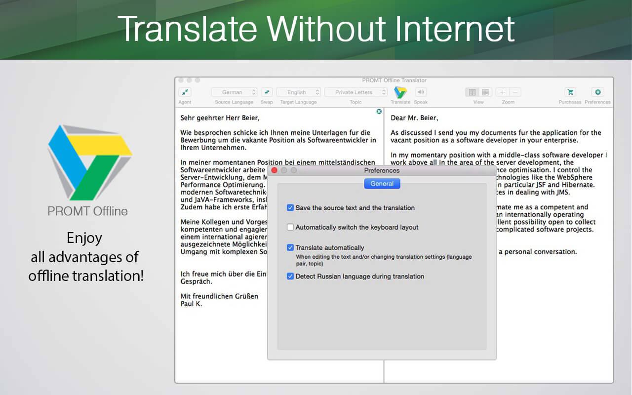 PROMT Offline Translator English Pack ابزاری بسیار کاربردی برای ترجمه متون در سیستم عامل های مک می باشد. نرم افزار PROMT Offline Translator English Pack دارای قابلیت های فراوانی می باشد که همه آنها را در یک مجموعه کامل در اختیار کاربران قرار می دهد. PROMT Offline Translator English Pack می تواند متنهایی را با هر اندازه از زبان های مختلفی از جمله انگلیسی به آلمانی ، فرانسوی ، اسپانیایی ، ایتالیایی ، پرتغالی و روسی ترجمه کند و بالعکس. حالت ویژه “PROMT Agent” این نرم افزار به شما امکان می دهد متن ها را در برنامه ها و مرورگرهای Mac خود به راحتی ترجمه کنید.