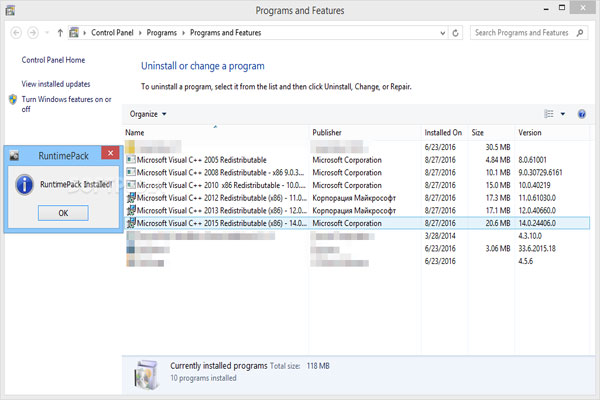 به طور کلی ،شامل یک مجموعه بسیار مفید و ضروری است که توصیه می کنیم بلافاصله پس از نصب مجدد ویندوز آن را نصب کنید. روش نصب فقط با دو کلیک ساده انجام می شود. فقط کافی است که پرونده اجرایی را اجرا کنید ، پیشنهاد را برای شروع نصب تأیید کنید و منتظر بمانید تا روند به پایان برسد. اگر قبلاً نسخه دیگری از توزیع مجدد بسته در رایانه شما نصب شده باشد ، آنگاه RuntimePack بطور خودکار آن را از لیست نصب حذف می کند.