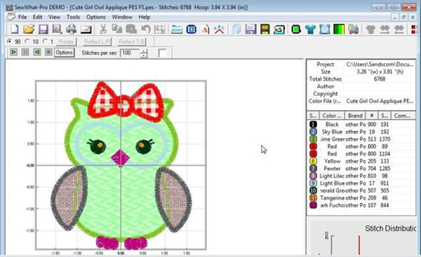 یک نرم افزار تخصصی و کاربردی برای مشاهده و ویرایش فایل های گلدوزی در زمینه خیاطی میباشد . نرم افزار Sandscomputing SewWhat  شامل ویژگی های مختلف مدیریت یکپارچه پروژه بوده و با افزونه MyriaCross برای تبدیل فایل های Cross-Stitch به فایل های گلدوزی در دسترس قرار داده است . خیاطان و طراحان گلدوزی با این نرم افزار می توانند طرح های خود را تغییر اندازه ، تغییر مکان و چرخش دهند و به طرح های پیش ساخته متن اضافه کنند و حتی شبیه سازی اجرای گلدوزی ها را مشاهده کنند . نرم افزار Sandscomputing SewWhat از چرخ های گلدوزی Toyota، Pfaff، janome، Bernina، Tajima، Brother پشتبانی میکند .