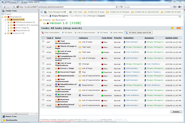 • DBMS: ORACLE 11g / IBM DB2 9 / MS SQL Server 2000 SP3, 2005, 2008 / Firebird 2.0 / PostgreSQL 9.3 / HSQLDB[Supplied with TrackStudio Enterprise] / MySQL 4.1